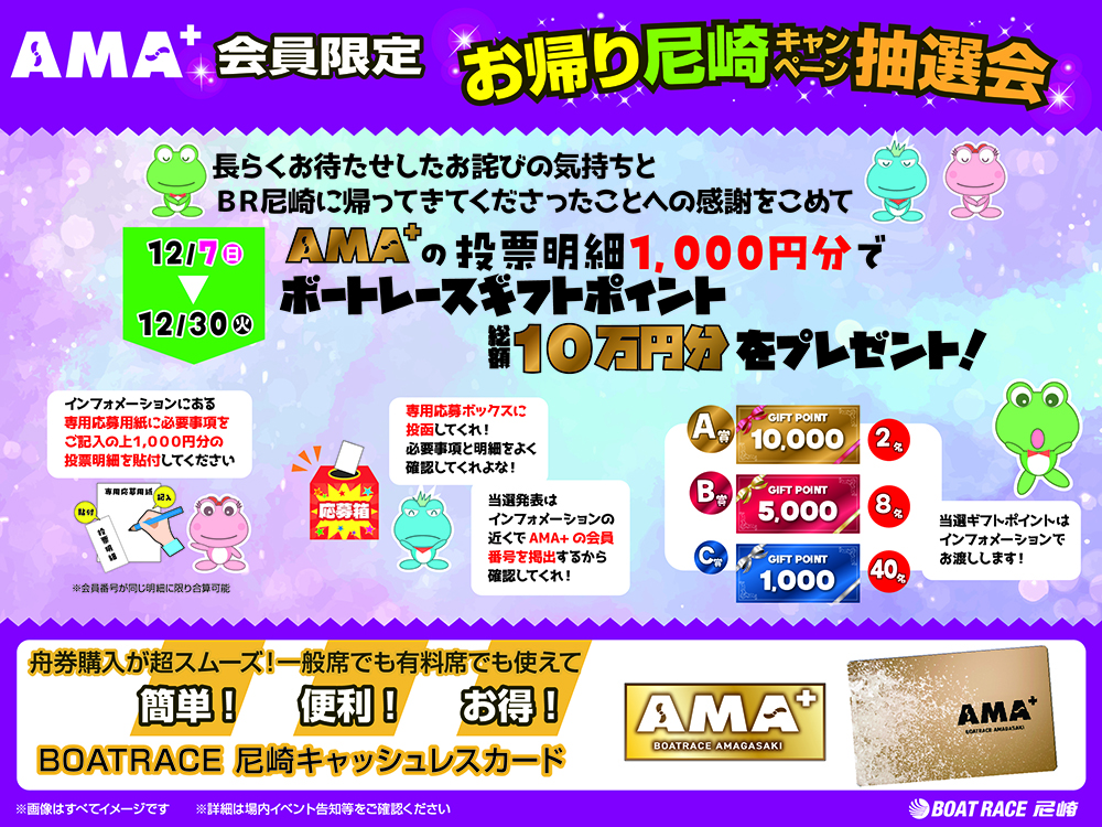 長らくお待たせしたお詫びの気持ちとBR尼崎に帰ってきてくださったことへの感謝の気持ちをこめてキャッシュレス会員限定で投票明細1,000円分を1口でボートレースギフトポイント総額10万円分を抽選でプレゼント。是非この機会をお見逃しなく!!
