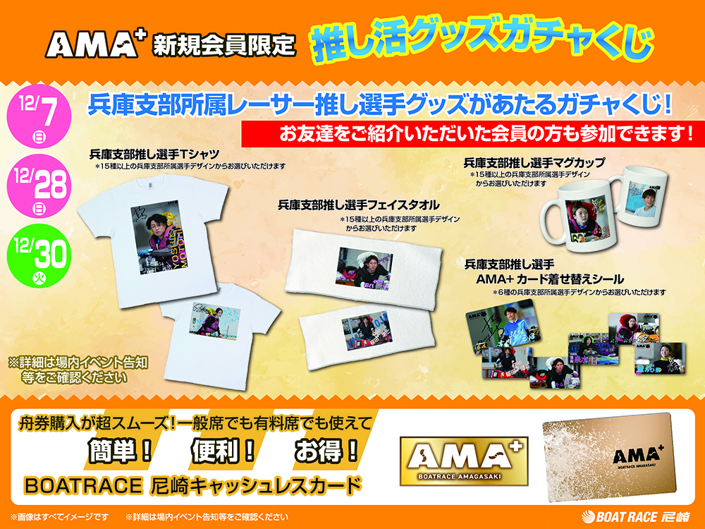 キャッシュレス投票サービス「AMA+」新規会員限定で、兵庫支部推し選手のグッズがあたるガチャくじを実施します。また、既に入会している方がお友達を紹介した場合もガチャくじに参加いただけます。さらに、ポイントを200ポイント利用した場合にもガチャくじに参加いただけます。詳細は、実施日インフォメーション横の入会ブースでご確認ください。是非この機会をお見逃しなく!!