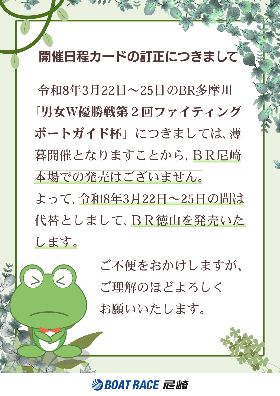 令和8年3月22日~25日のBR多摩川「男女W優勝戦第2回ファイティングボートガイド杯」につきましては、
