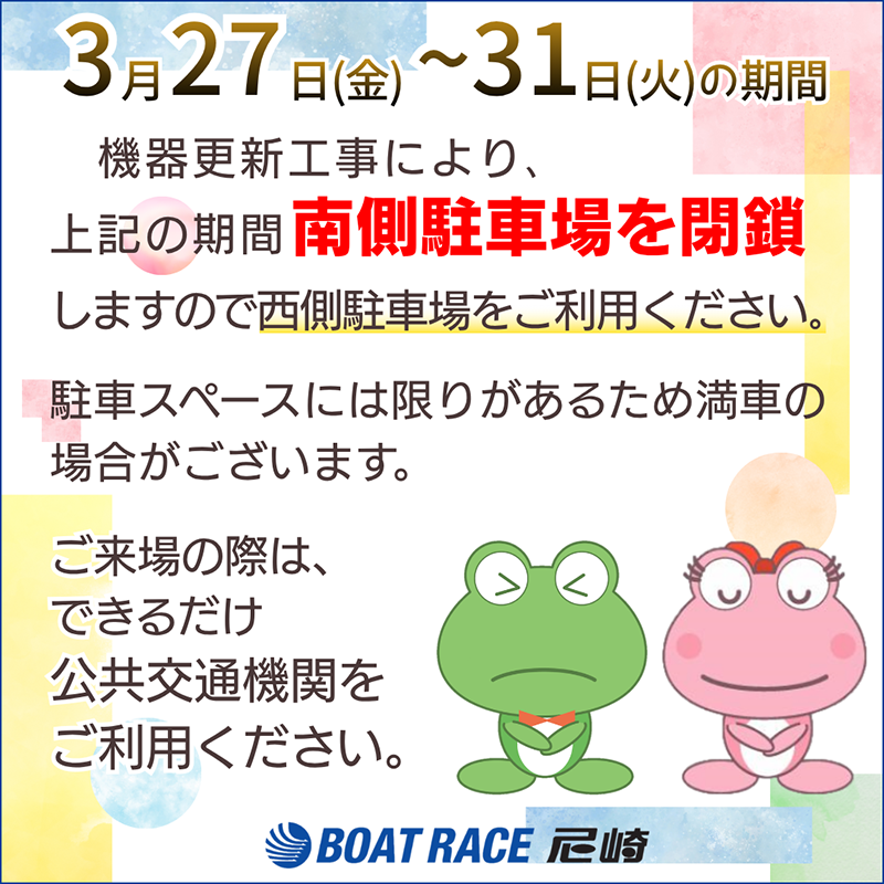 機器更新工事により、3月27日(金)~31日(火)の期間南側駐車場を閉鎖しますので、西側駐車場をご利用ください。