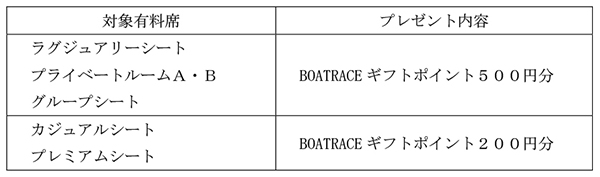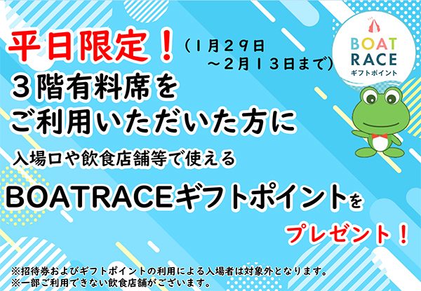 内容:対象期間の平日限定で、有料席をご利用のお客様に場内で利用できる『BOATRACEギフトポイント』をプレゼント!この機会に是非、ご利用くださいませ!