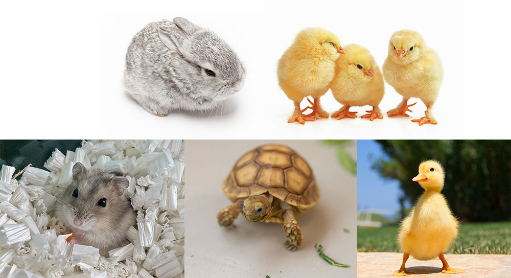 ウサギ、モルモット、ハムスター、ひよこ、リクガメ、コーンスネーク など