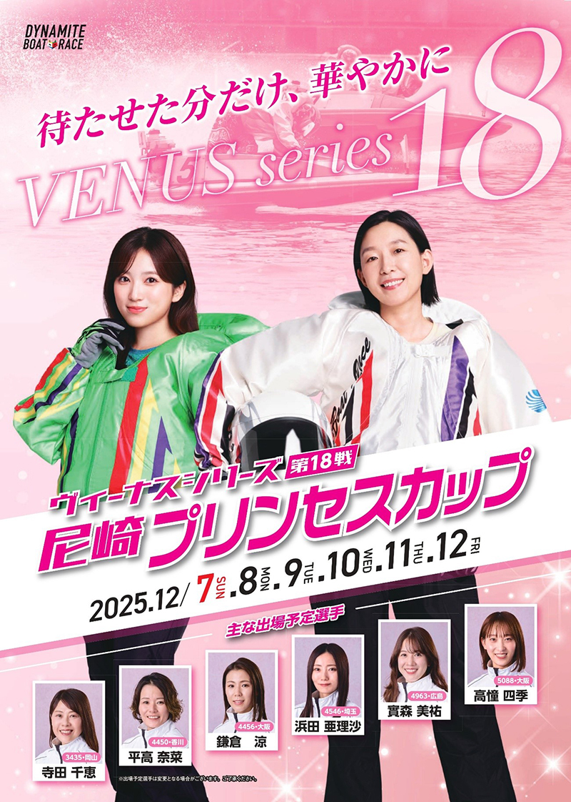 )「ヴィーナスシリーズ第18戦 尼崎プリンセスカップ」開催初日は、選手紹介式等を実施するため、開門時間が9:30(有料席利用者 先行入場は9:20)となります。
